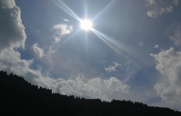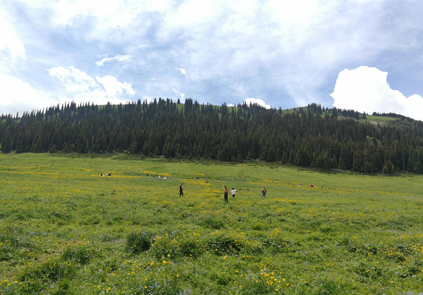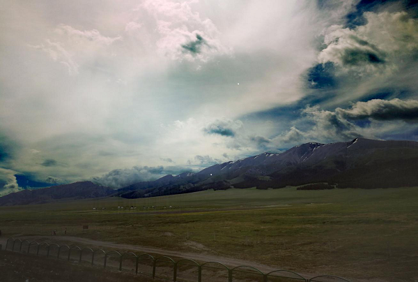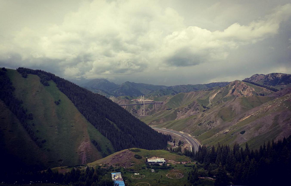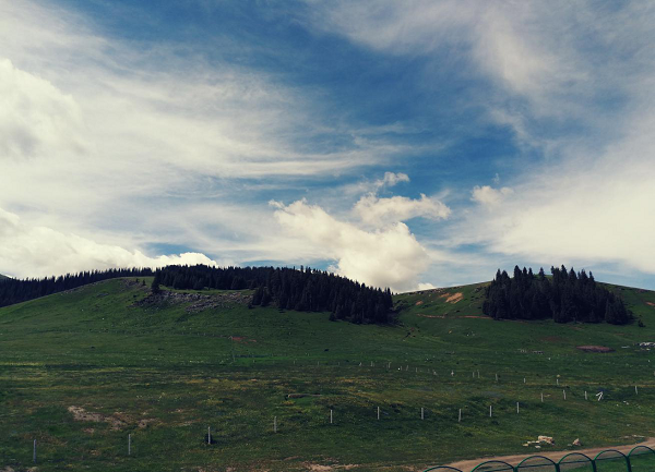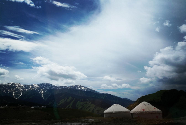 不一会儿,天空突然下起了大雨,大家都急急忙忙的躲进毡房避雨。不到十分钟雨停了,尽管如此,放眼望去山依旧那么美丽,给人以清新的感觉;果子沟大桥依旧气势宏伟,给人以无限遐想